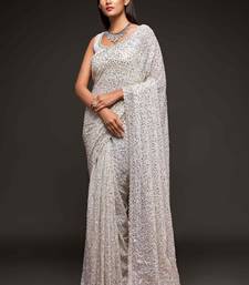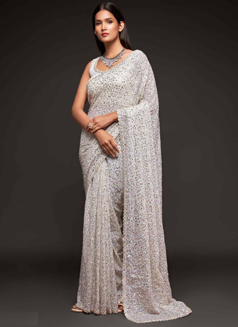 Off white embroidered georgette saree with blouse