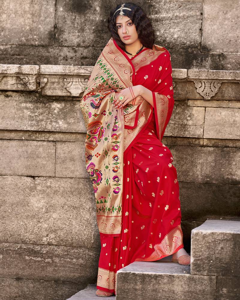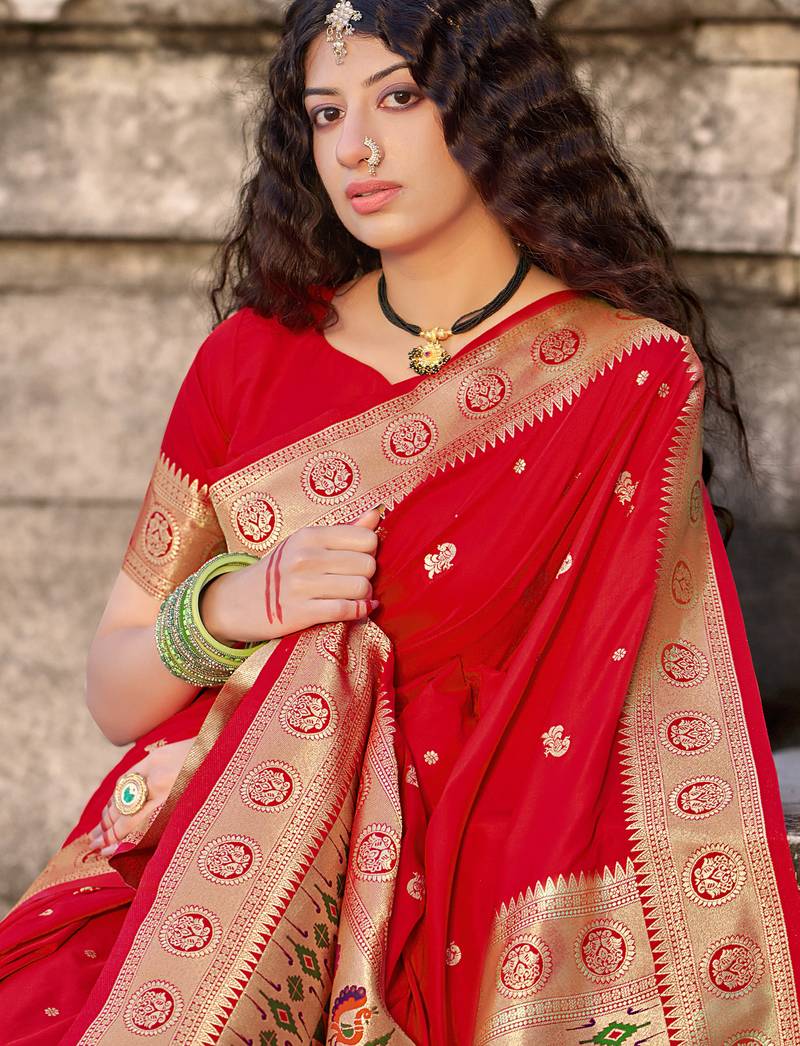 Red woven banarasi silk saree with blouse