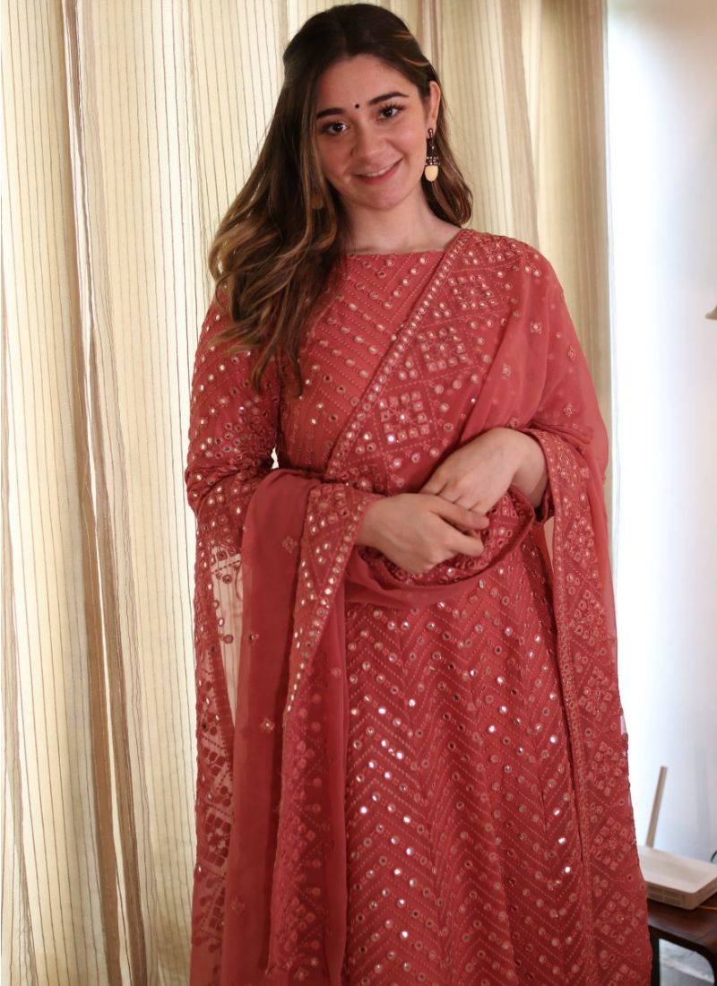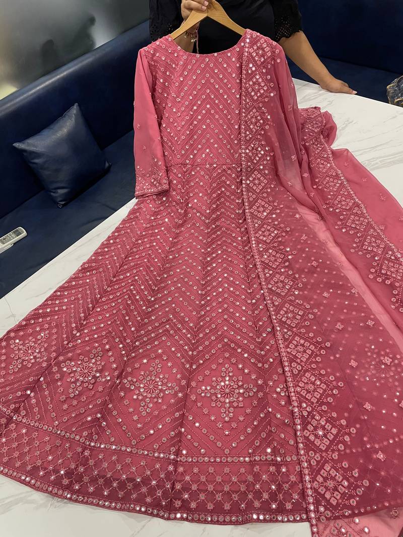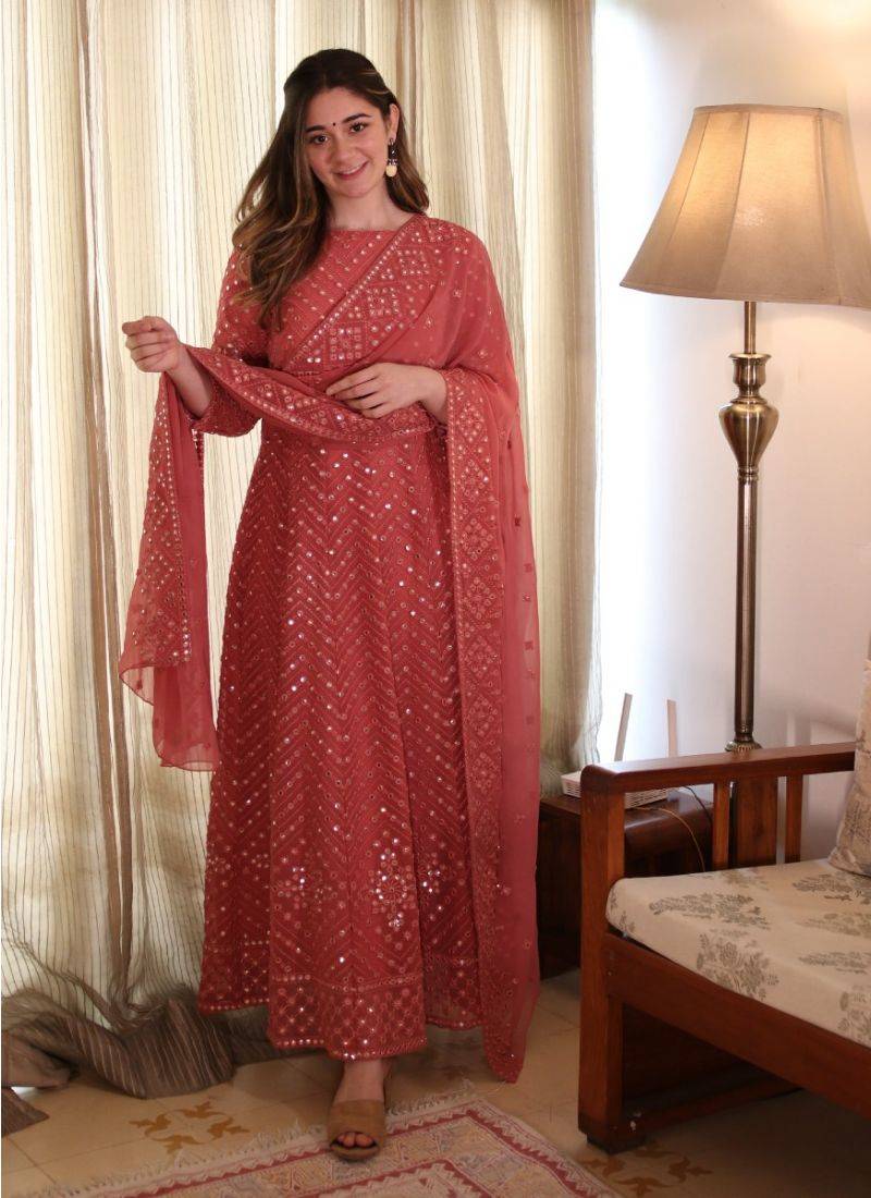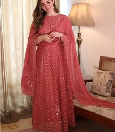 Fantastic coral pink color georgette base festive wear designer anarkali suit semi stitched