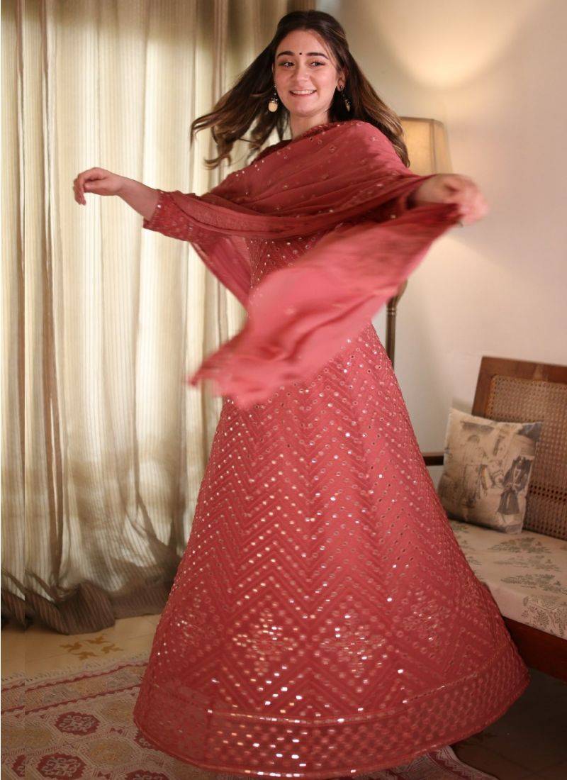 Product Name | Fantastic Coral Pink Color Georgette Base Festive Wear Designer Anarkali Suit | |