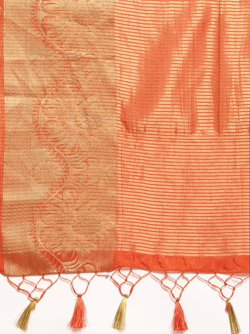| Product Description | Burgundy Color Traditional Saree, With Woven Self All Over, Has Zari Woven Border And Pallu And Tussel Work At The End , Comes With Orange Color Contrast Unstiched Blouse (Included In Sarees Length 5.40 Mtr+.80 Cm) |