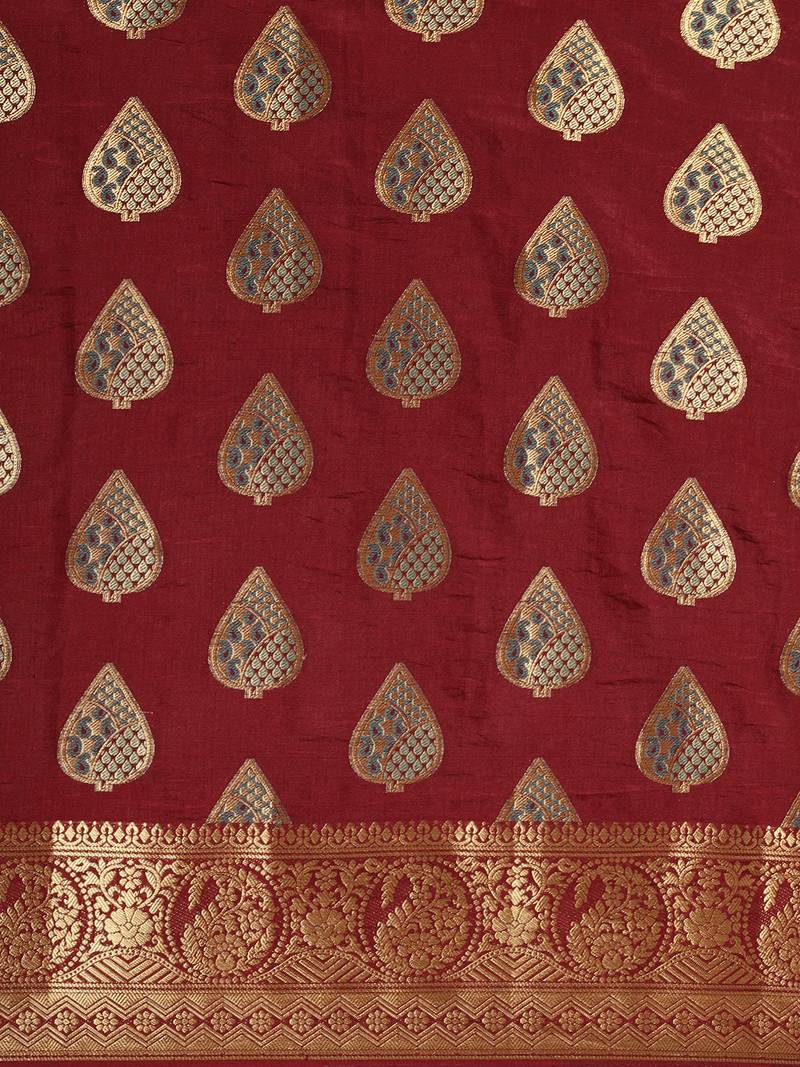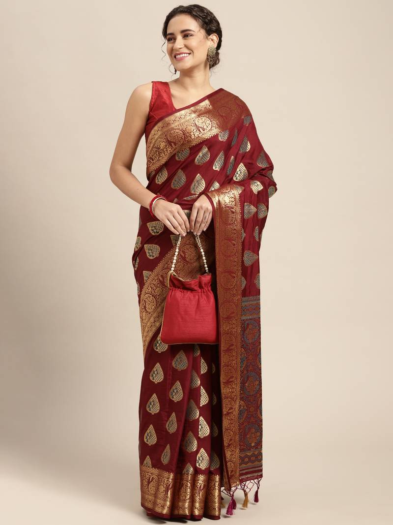 | Product Description | Burgundy Color Traditional Saree, With Woven Mixture Of Zari And Gicha Thread Design All Over , Has Zari Woven Border And Pallu And Tussel Work At The End , Comes With Burgundy Color Running Unstiched Brocade Blouse (Included In Sarees Length 5.40 Mtr+.80 Cm) |