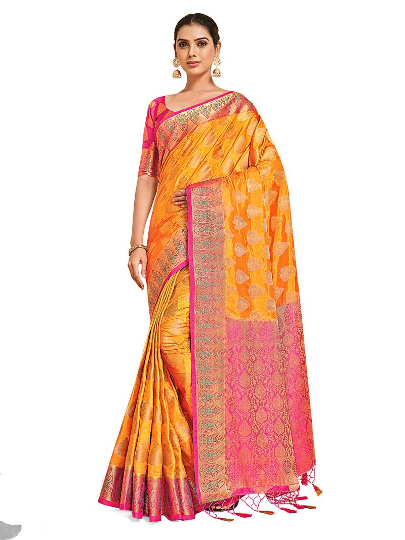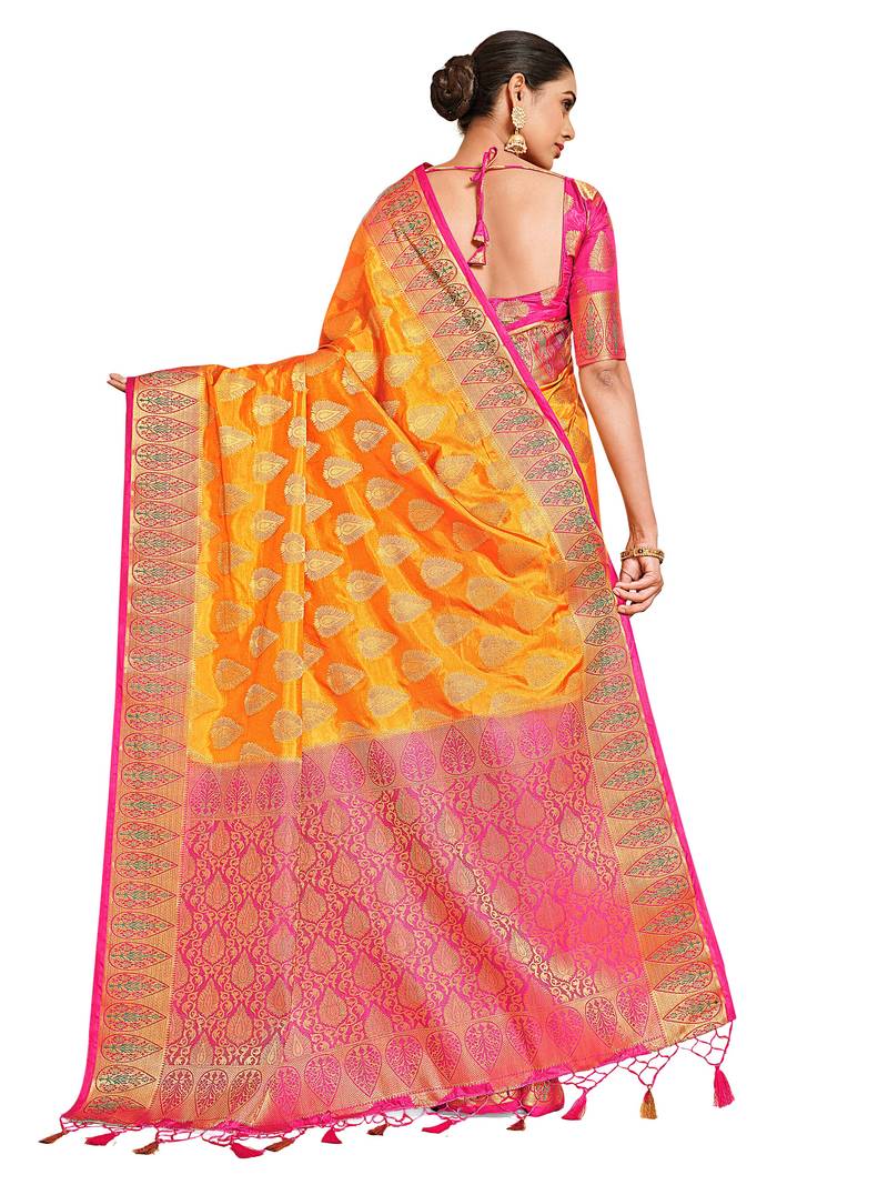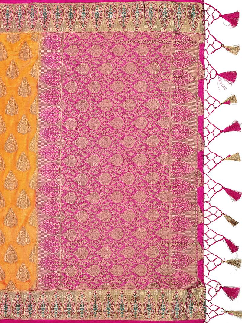 | Product Description | Mustard Color Traditional Saree, With Woven Zari Butty All Over With Meena Woven Motif Border, Has Zari Woven Border And Pallu And Tussel Work At The End , Comes With P Ink Color Contrast Unstiched Brocade Blouse (Attached At The Last Of Saree) |