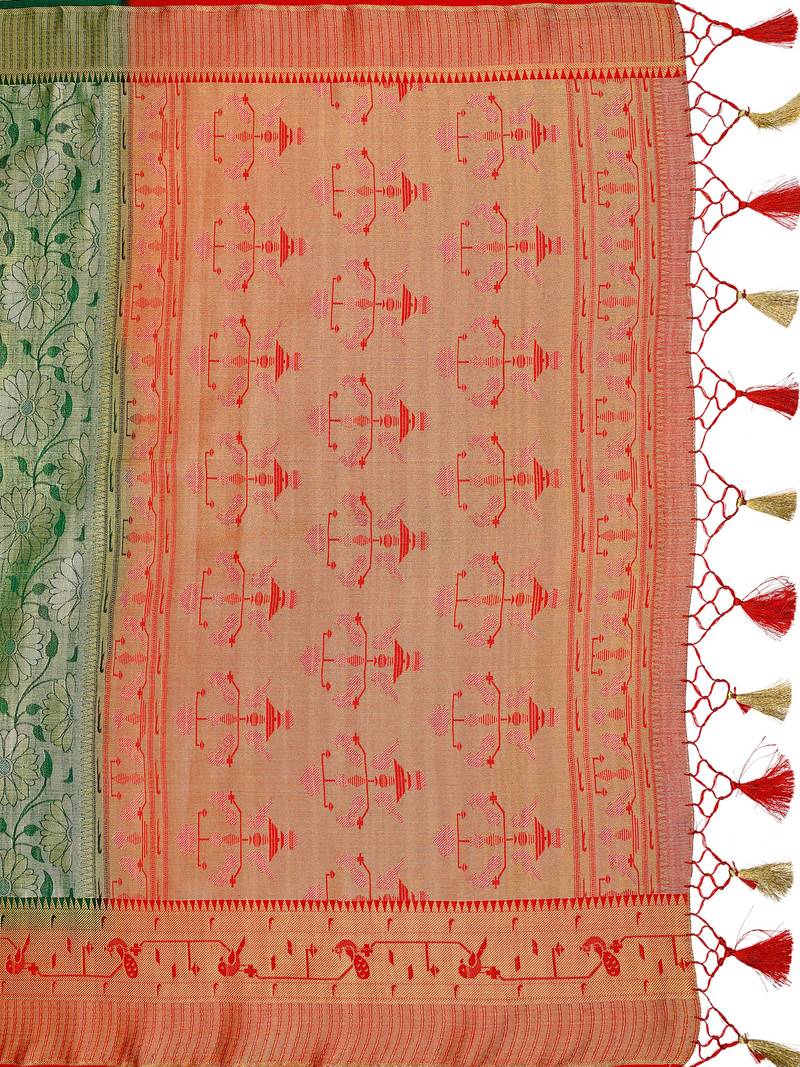 | Product Description | Green Color Traditional Saree, With Woven Mixture Of Zari And Kalamkari Thread Design All Over , Has Zari Woven Border And Pallu And Tussel Work At The End , Comes With Red Color Contrast Unstiched Brocade Blouse (Attached At The Last Of Saree) |