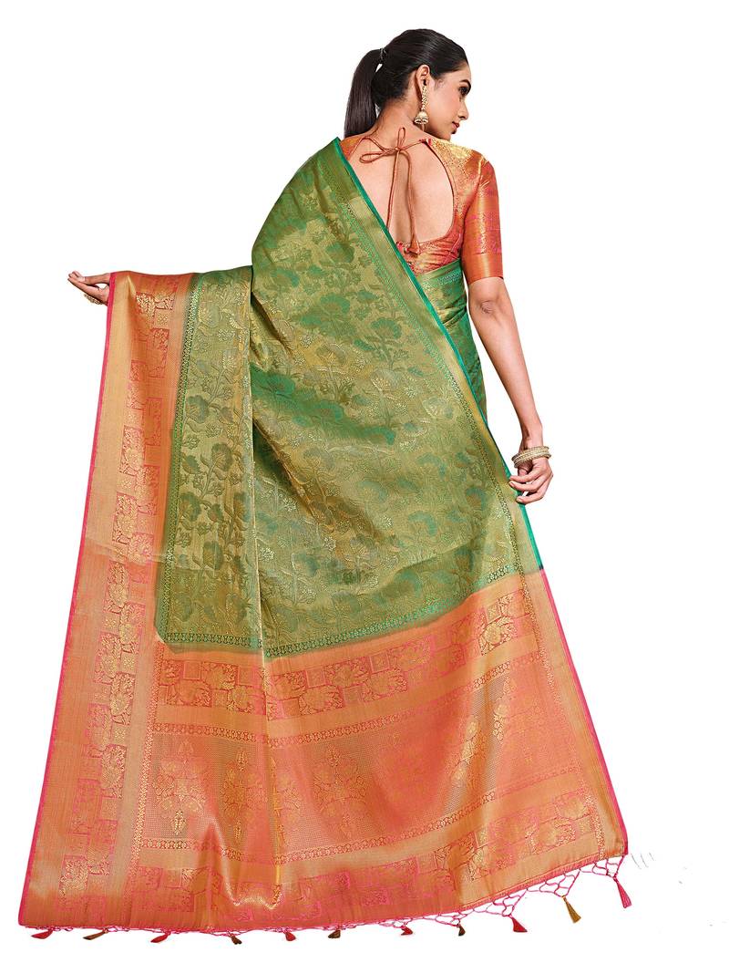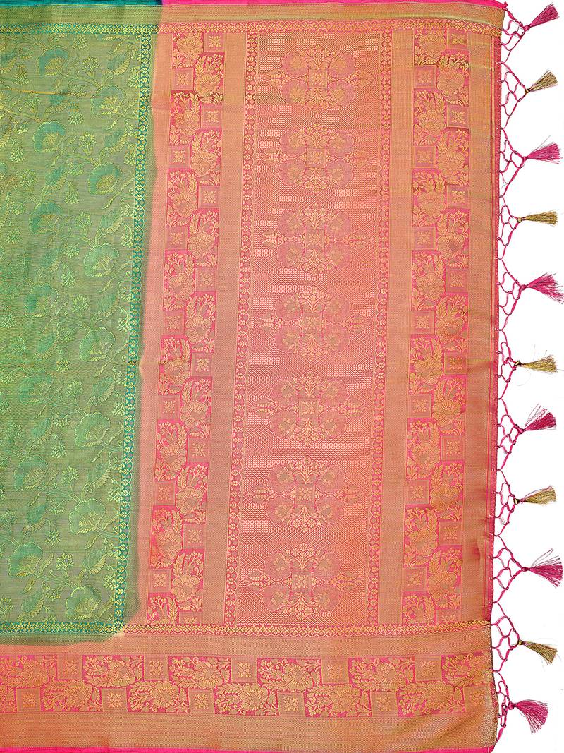 | Product Description | Green Color Traditional Saree, With Woven Embose And Zari Design All Over , Has Zari Woven Border And Pallu And Tussel Work At The End , Comes With Pink Color Contrast Unstiched Brocade Blouse (Attached At The Last Of Saree) |