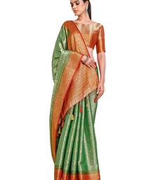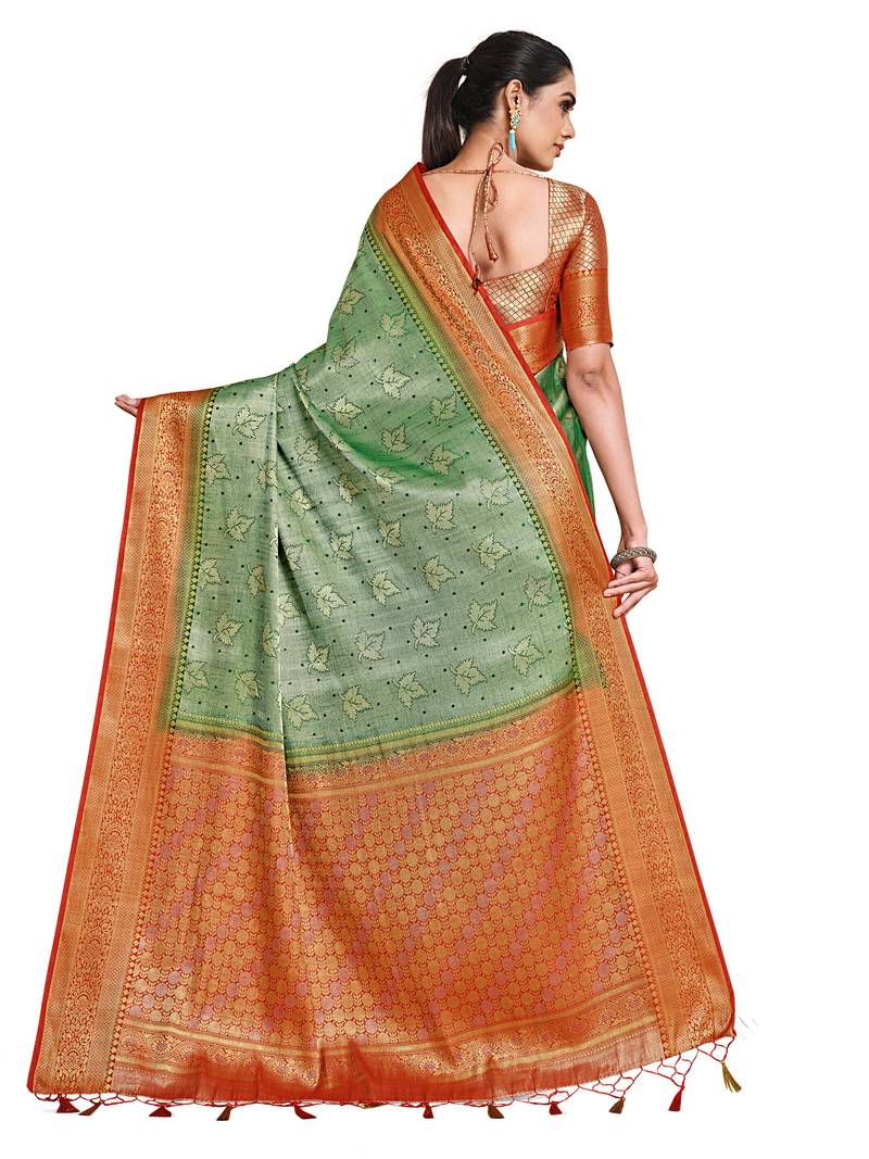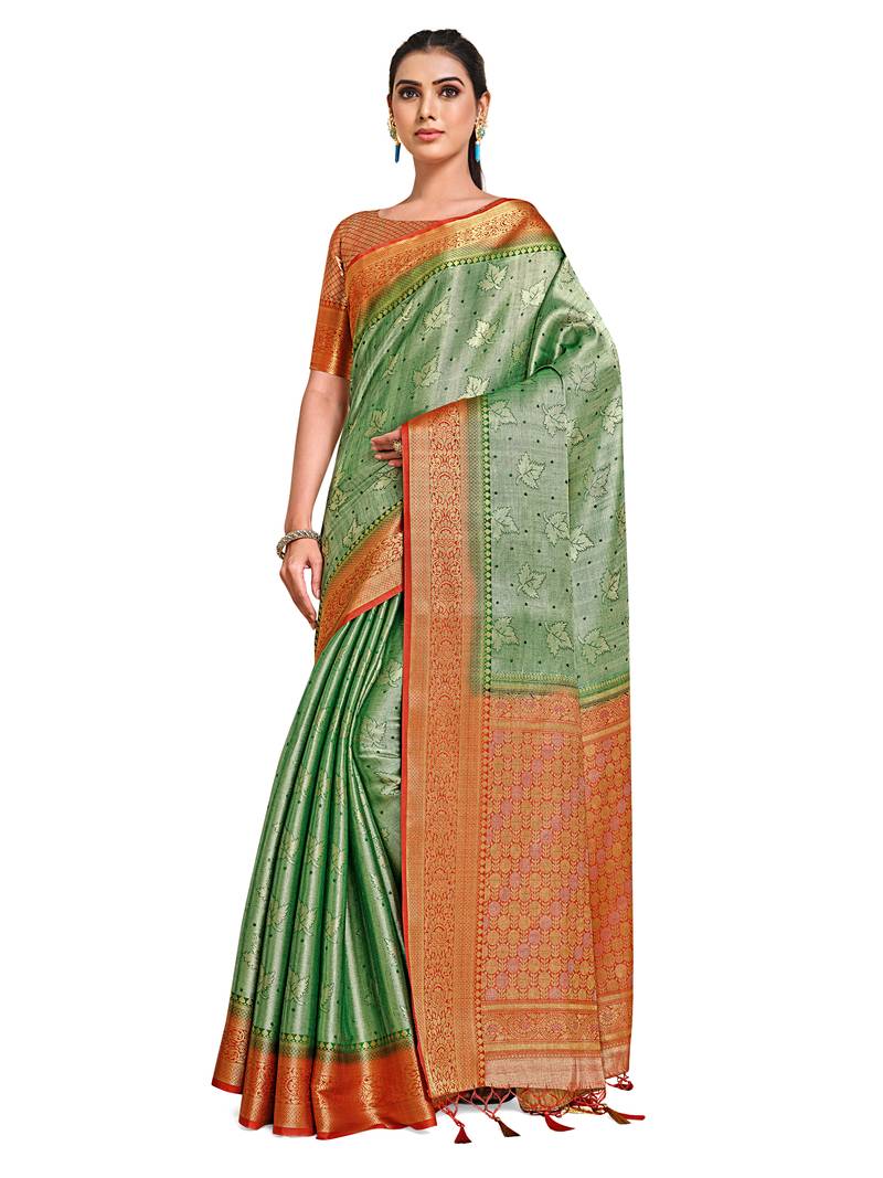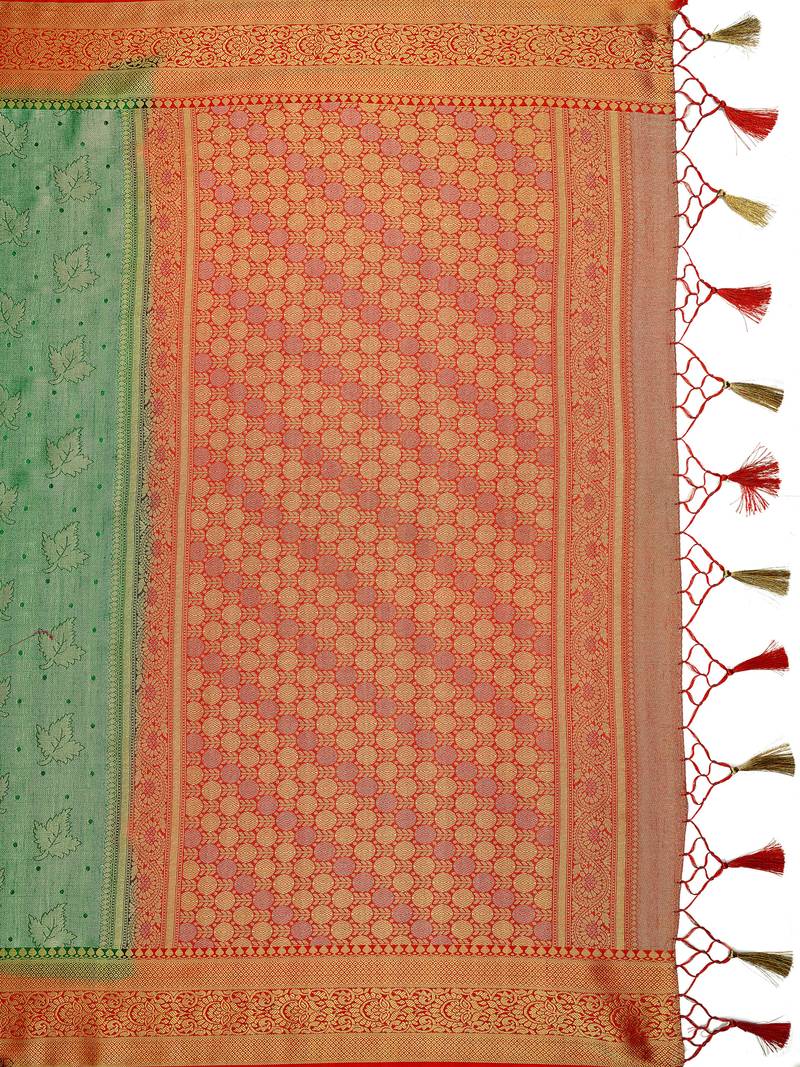 | Product Description | Green Color Traditional Saree, With Woven Mixture Of Zari And Gicha Thread Design All Over , Has Zari Woven Border And Pallu And Tussel Work At The End , Comes With Rust Color Contrast Unstiched Brocade Blouse (Attached At The Last Of Saree) |