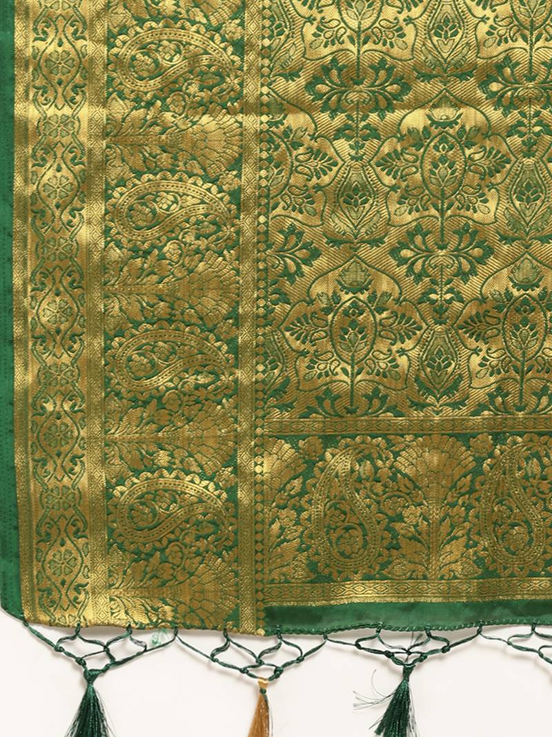 | Product Description | Green Color Traditional Saree, With Woven Zari Butty All Over, Has Zari Woven Border And Pallu And Tussel Work At The End , Comes With Green Color Contrast Unstiched Brocade Blouse (Attached At The Last Of Saree) |