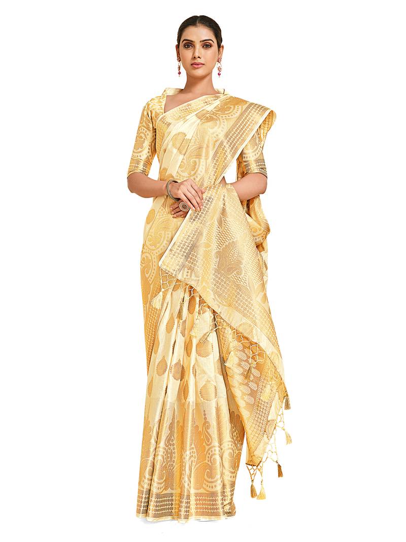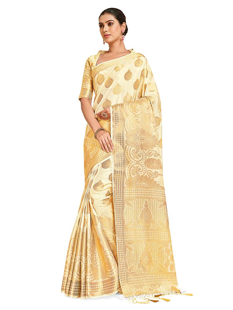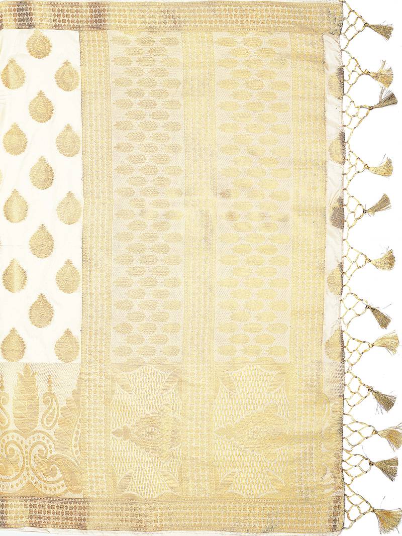 | Product Description | Off White Color Traditional Saree, With Woven Zari Design All Over , Has Zari Woven Border And Pallu And Tussel Work At The End , Comes With Off White Color Running Unstiched Brocade Blouse (Included In Sarees Length 5.40 Mtr+.80 Cm) |