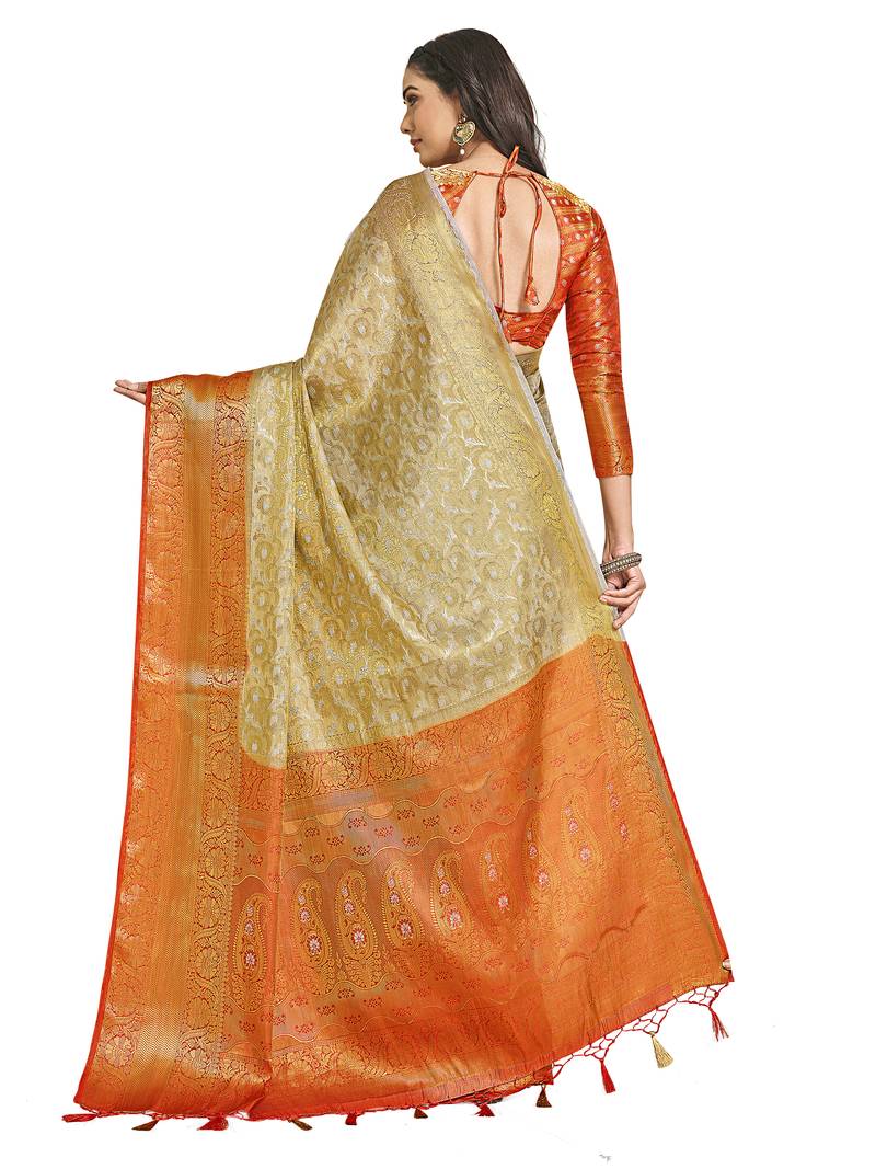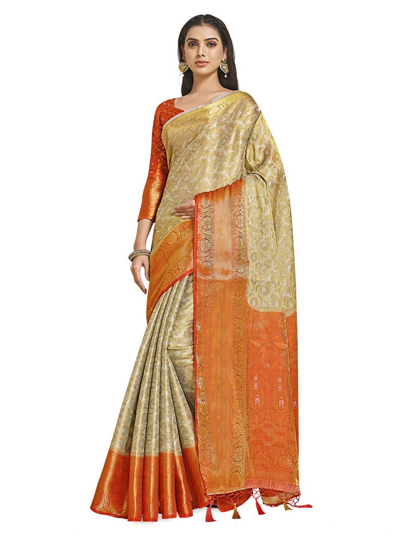 | Product Description | Off White Color Traditional Saree, With Woven Mixture Of Zari And Kalamkari Thread Design All Over , Has Zari Woven Border And Pallu And Tussel Work At The End , Comes With Rust Color Contrast Unstiched Brocade Blouse (Attached At The Last Of Saree) |
