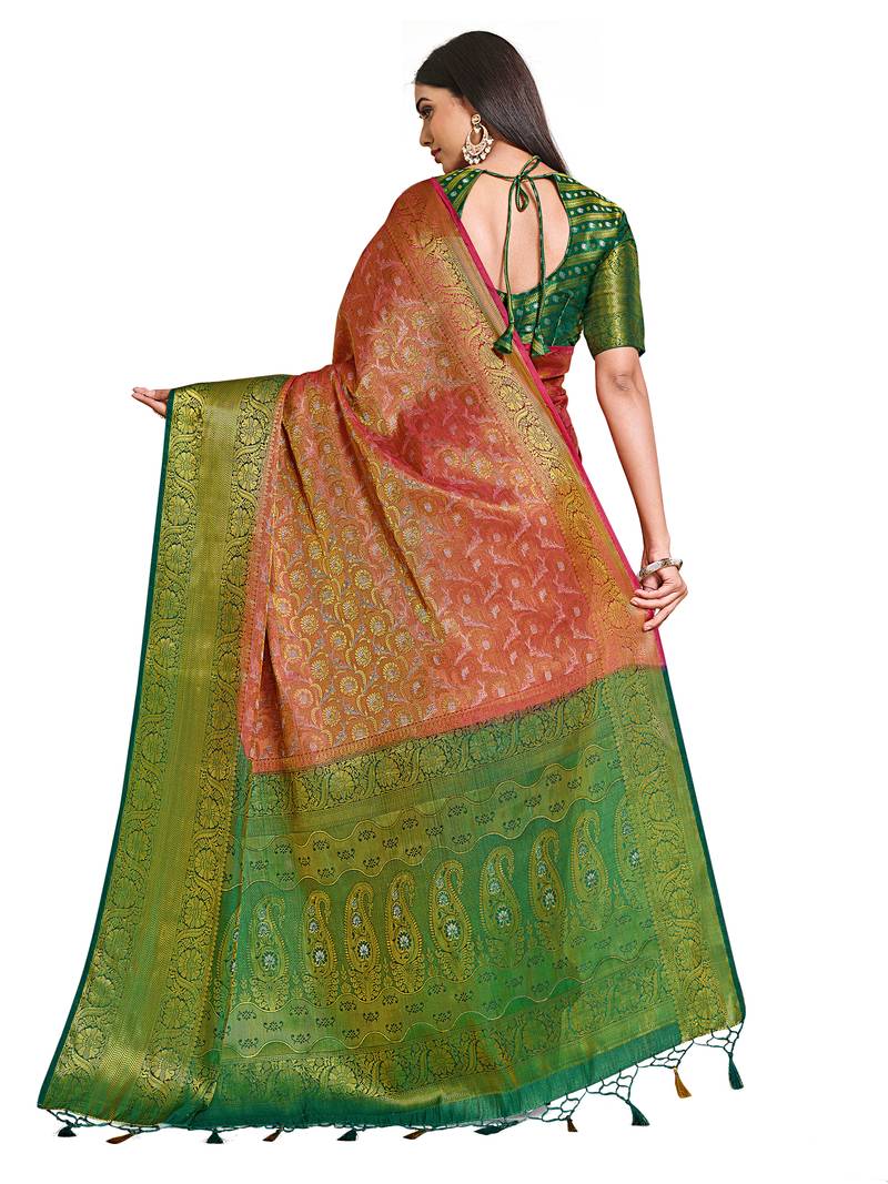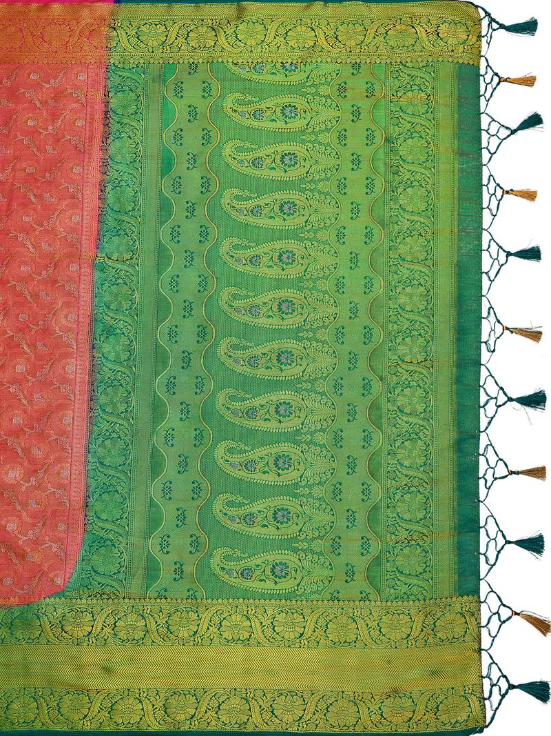| Product Description | Pink Color Traditional Saree, With Woven Mixture Of Zari And Kalamkari Thread Design All Over , Has Zari Woven Border And Pallu And Tussel Work At The End , Comes With Teal Color Contrast Unstiched Brocade Blouse (Attached At The Last Of Saree) |