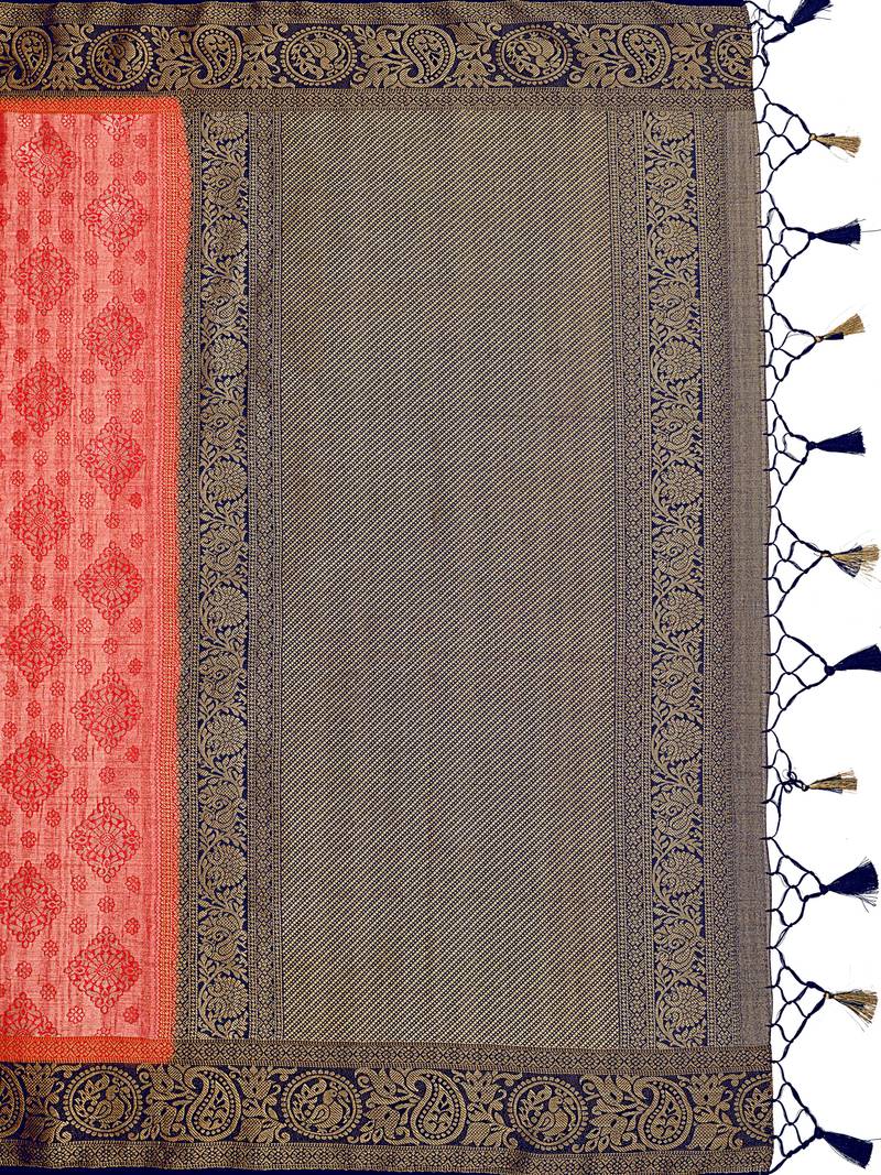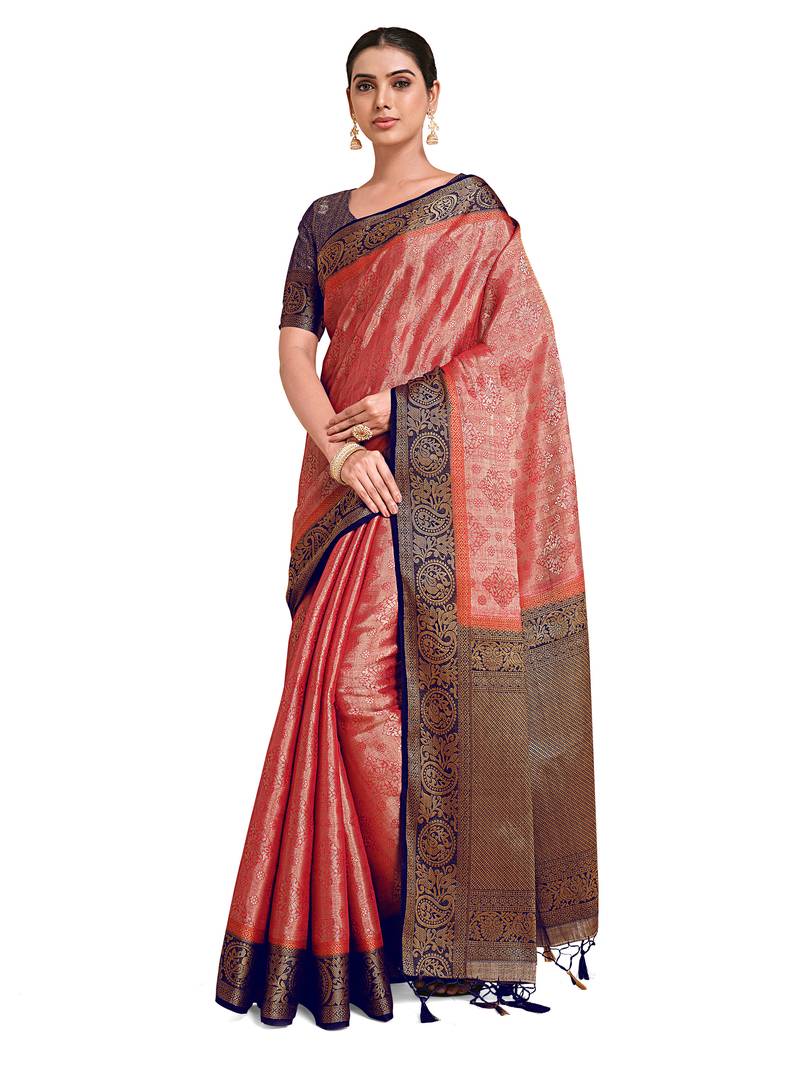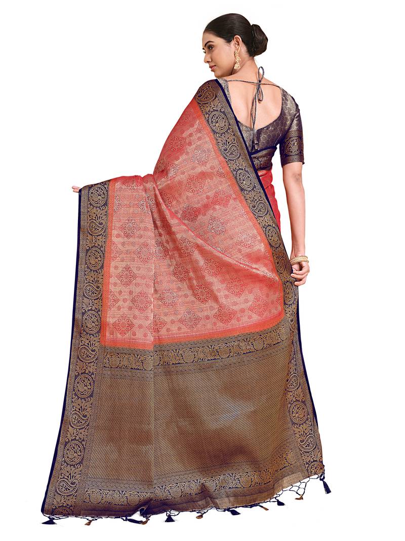 | Product Description | Coral Color Traditional Saree, With Woven Mixture Of Zari And Gicha Thread Design All Over , Has Zari Woven Border And Pallu And Tussel Work At The End , Comes With Navy Blue Color Contrast Unstiched Brocade Blouse (Attached At The Last Of Saree) |