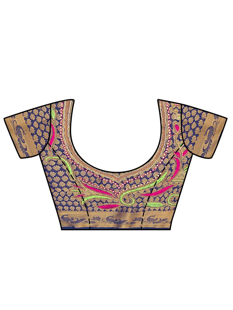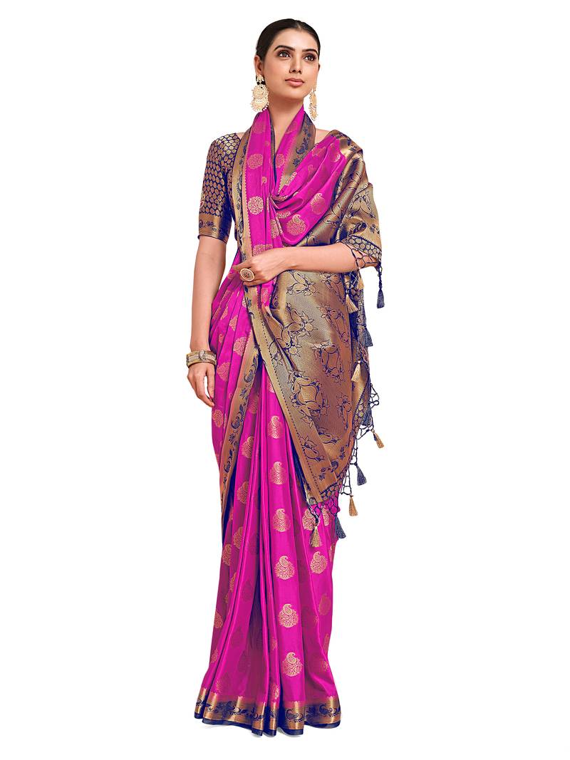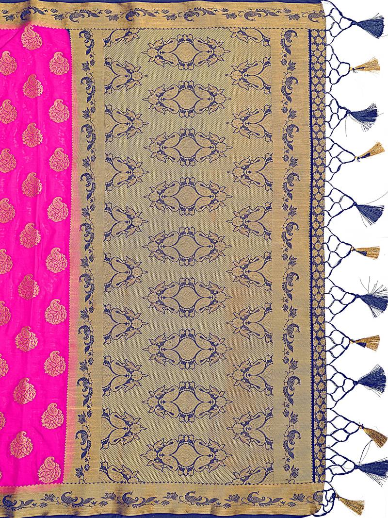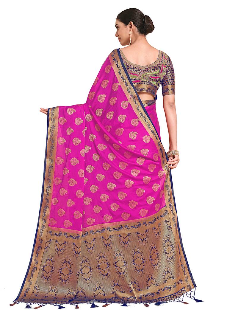 | Product Description | Pink Color Traditional Saree, With Woven Zari Butty All Over, Has Zari Woven Border And Pallu And Tussel Work At The End , Comes With Navy Blue Color Contrast Handwork Embrodered Blouse (Attached At The Last Of Saree) |
